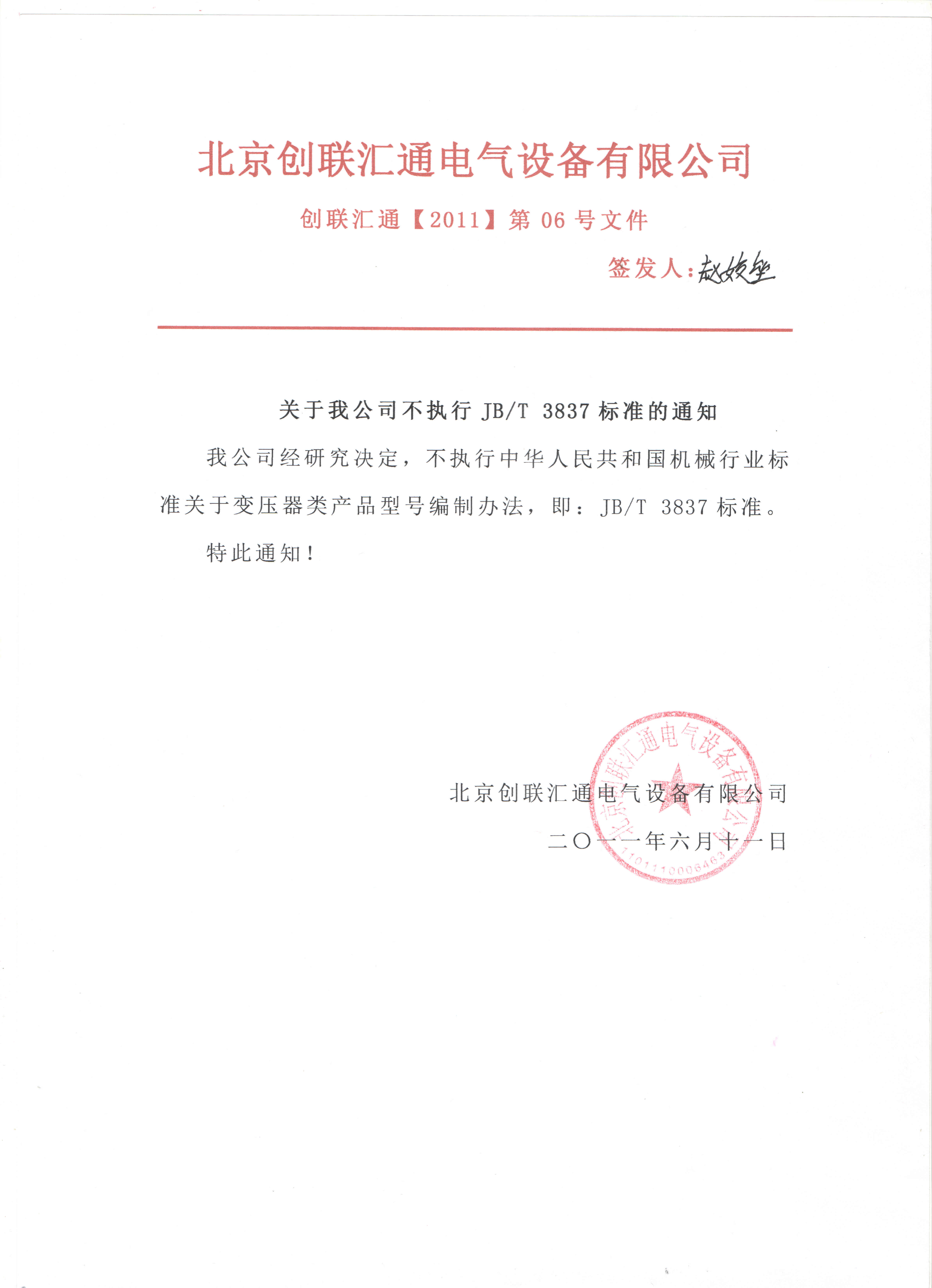 我公司不執(zhí)行JB/T 3837標(biāo)準的通知