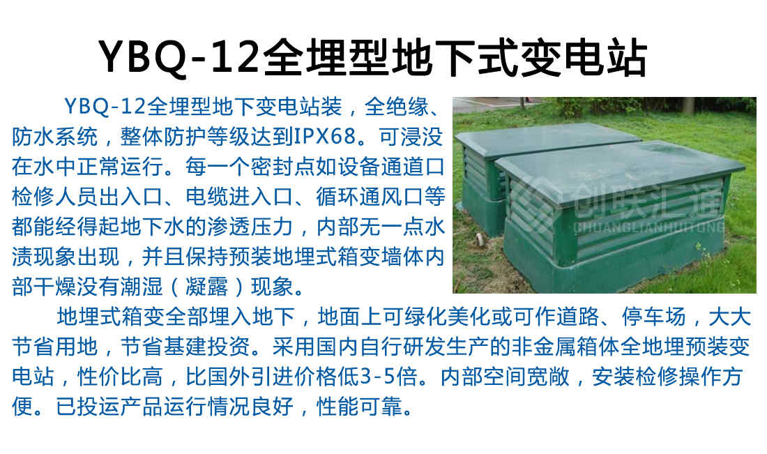 地埋式箱變主要由地埋式變壓器和廣告燈箱式的戶外開關設備組成。地埋式變壓器是由變壓器、高壓負荷開關、熔斷器等組合在一起的一種新型的緊湊型的變電設備,它安裝在地坑中,不占用地表空間,而且能在一段時間內浸沒在水中運行。廣告燈箱式的戶外開關設備為集廣告牌及戶外開關設備為一體的混合結構,安裝在地面。箱體內部為戶外高低壓配電柜,兩側為廣告燈箱,具有極佳的視覺效果。